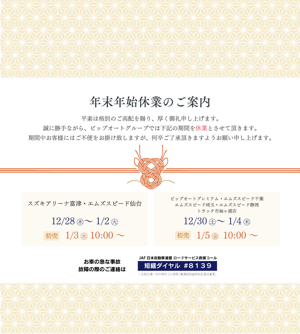 お客様各位 平素は格別のご高配を賜り厚く御礼申し上げます。 誠に勝手ながら、年末年始期間を休業日とさせていただきます。 ご不便をお掛け致しますが、何卒ご了承の程宜しくお願い申し上げます。 尚、…